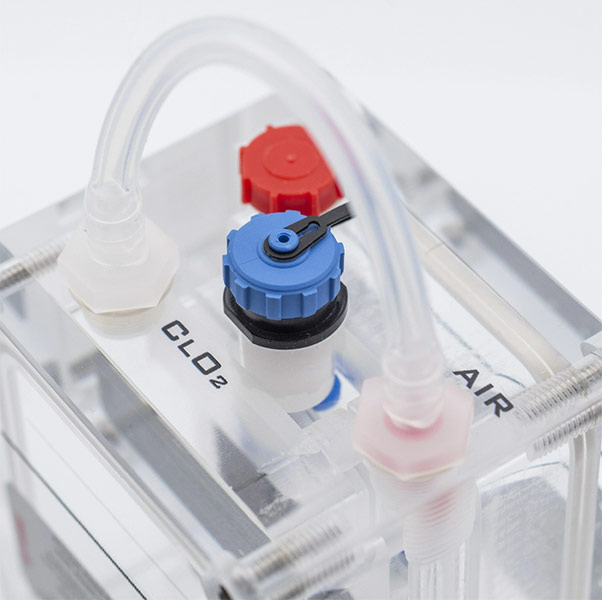 Suavidad del ClO2 – el gas ClO2 producido mediante la electrólisis es mucho más soportable y suave que el que se produce por vía química. Esto se debe a una forma completamente nueva de producción electroquímica del ClO2 y la ausencia de impurezas en la solución.