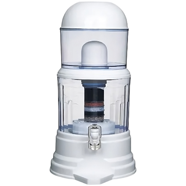 Filtro Purificador De Agua Bioenergético sin Electricidad con una capacidad total de 16 Litros. El purificador de agua tiene un sistema de filtrado que asemeja el filtrado que realiza la naturaleza, de esta manera contribuye a proporcionar agua saludable.